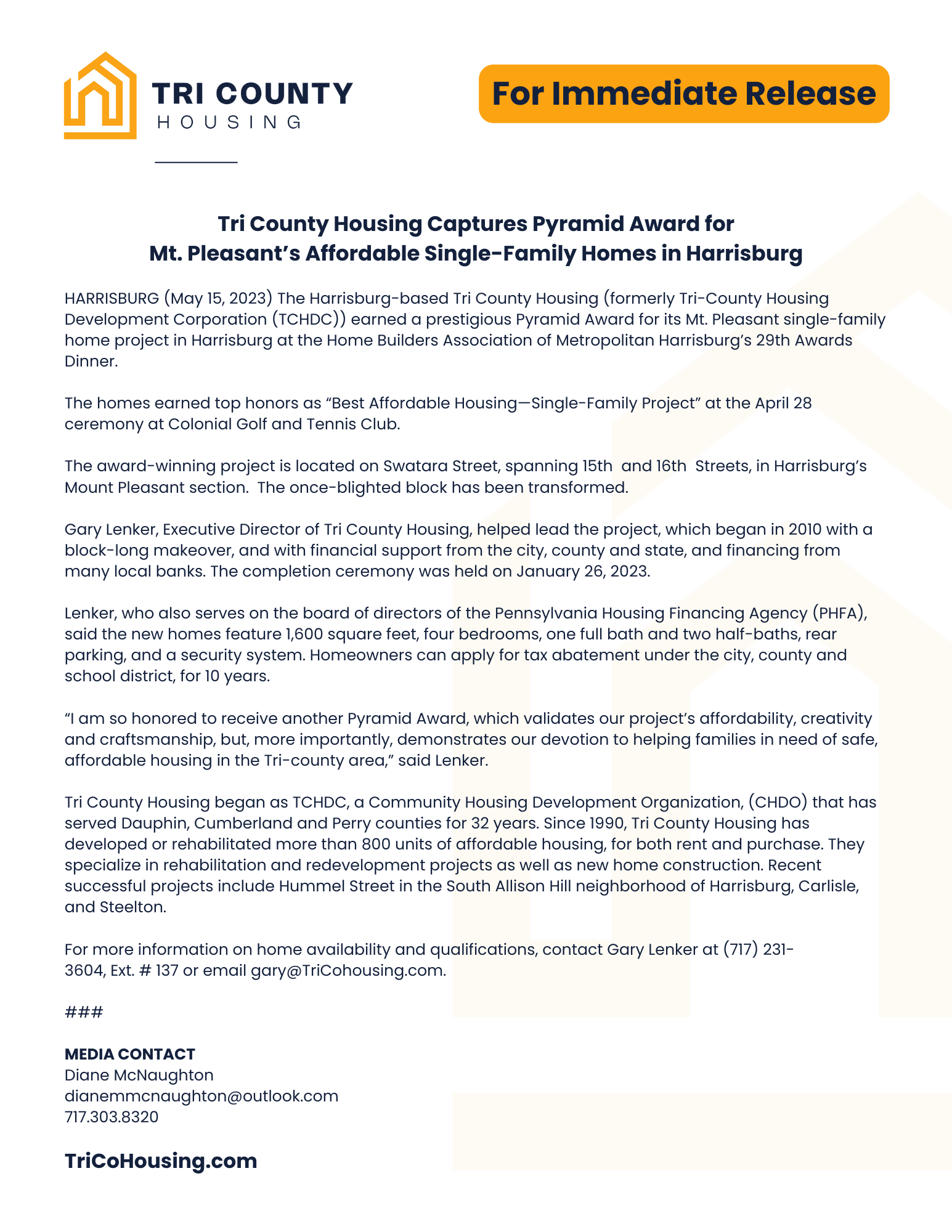 HARRISBURG (May 15, 2023) The Harrisburg-based Tri County Housing (formerly Tri-County Housing Development Corporation (TCHDC)) earned a prestigious Pyramid Award for its Mt. Pleasant single- family home project in Harrisburg at the Home Builders Association of Metropolitan Harrisburg’s 29th Awards Dinner.